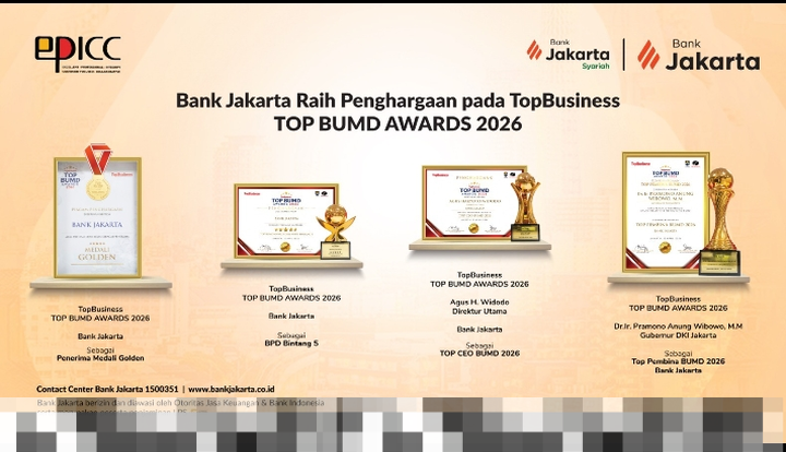 Dalam ajang TOP BUMD Awards 2026, Bank Jakarta memperoleh beberapa penghargaan prestisius, termasuk kategori TOP BUMD Awards 2026 BPD Bintang 5 (Excellent). Selain itu, Direktur Utama Bank Jakarta, Agus Haryoto Widodo, dianugerahi gelar TOP CEO BUMD 2026, dan Bank Jakarta juga berhasil meraih medali Golden. Penghargaan ini juga mencakup apresiasi kepada Gubernur Provinsi DKI Jakarta, Pramono Anung, sebagai TOP Pembina BUMD 2026.